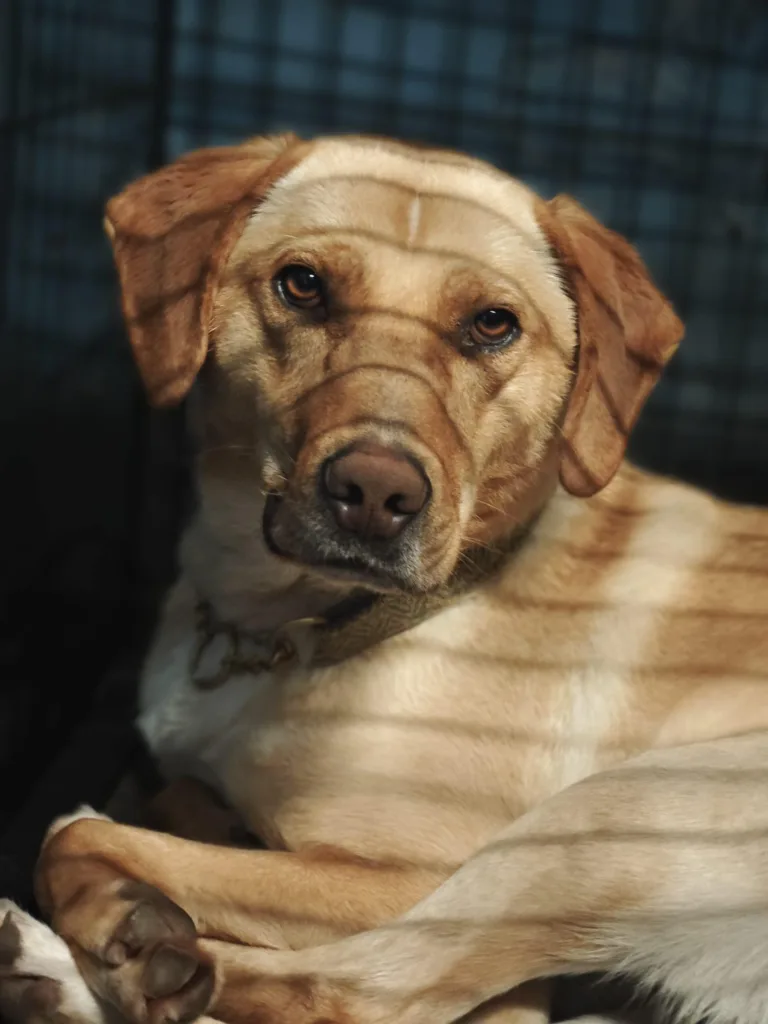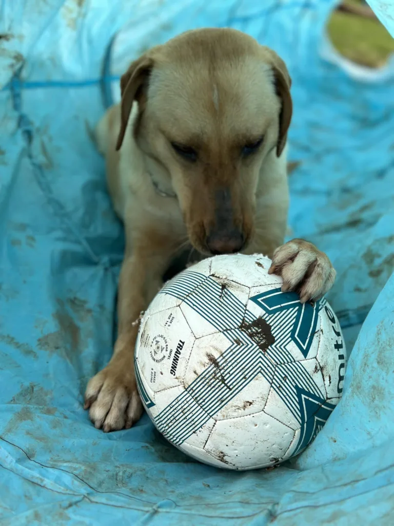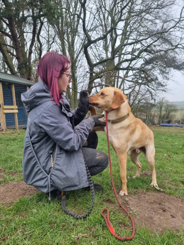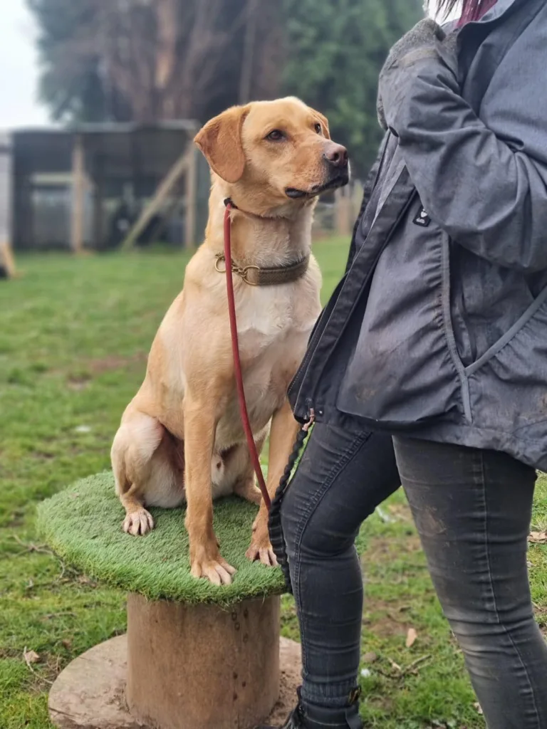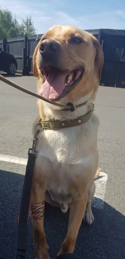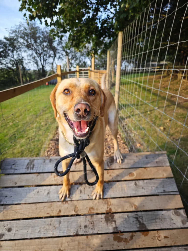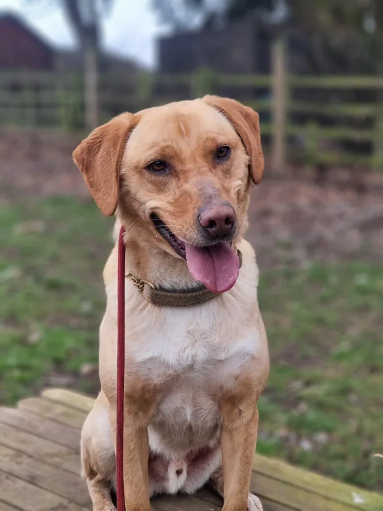 Our boy Freddie is a much-loved resident at our kennels. He is a handsome lad with a charming personality, dirty blonde fur and gorgeous amber eyes. He is happiest when he’s playing in our field with his football, and he might even let you get a few kicks in if you can catch him.
