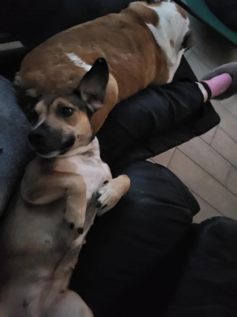 Leena needs another dog in the home, as she can be quite anxious and gains a lot of confidence from canine companionship. She is absolutely thriving in foster care, where she lives with three English Bulldogs and enjoys playtime with a visiting Boxer. She loves snuggling on the sofa and is perfectly happy for her larger friends to rest their big heads on her during cuddle time. She has also recently discovered that she rather enjoys curling up on laps too.