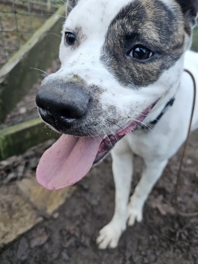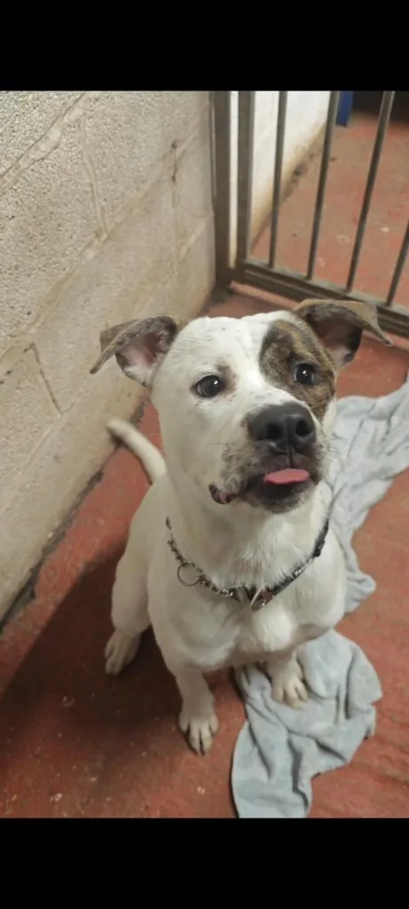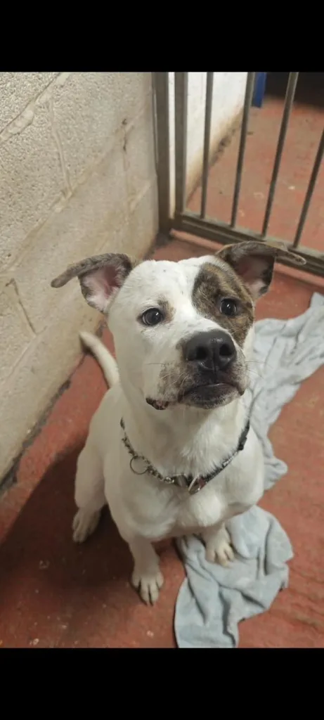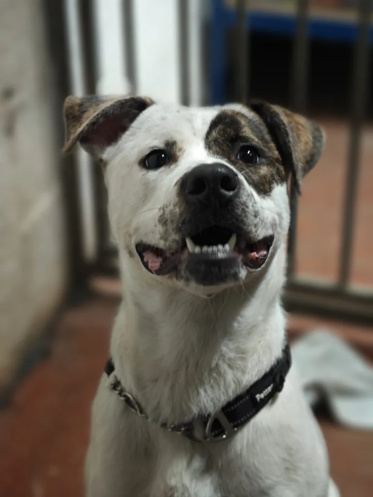 Maggie Mabel, you absolute nutter! This lovable little lady is searching for a home where she can give you all the love she possibly can. She is a gorgeous girl with mostly white fur, complemented by beautiful brindle ears and an eye patch. She has one of those faces you instantly fall in love with. We believe Maggie Mabel is a Boxer cross, and she certainly has the classic Boxer traits. Affectionate, funny and goofy, with plenty of energy to match.