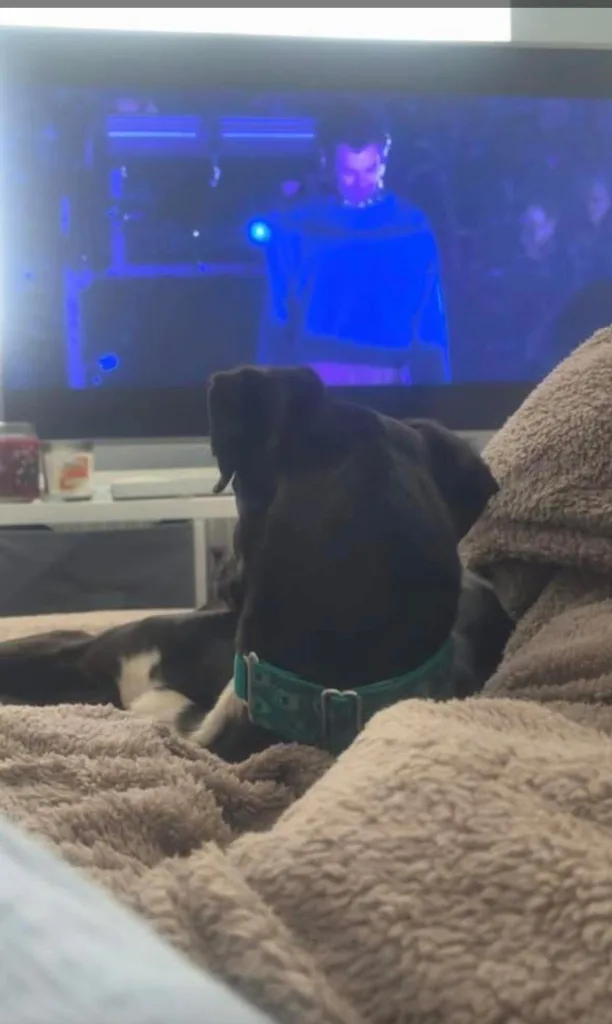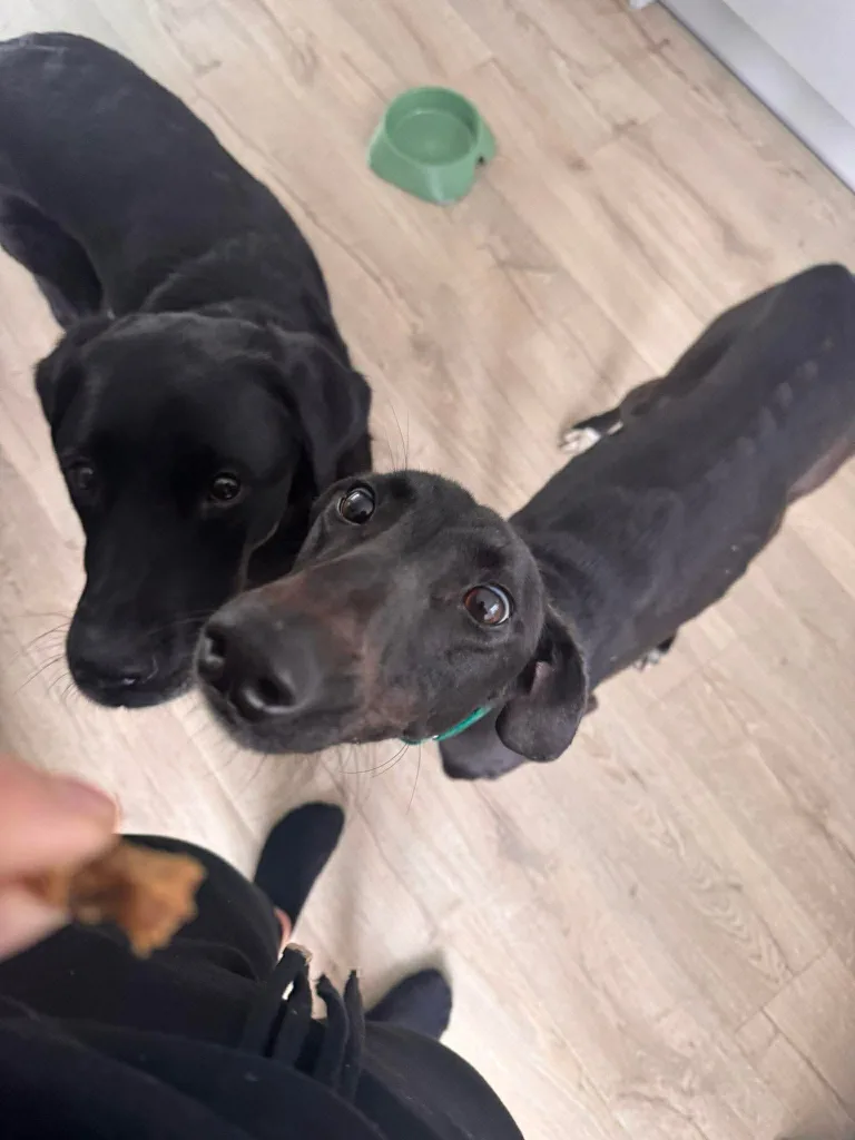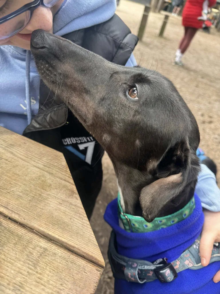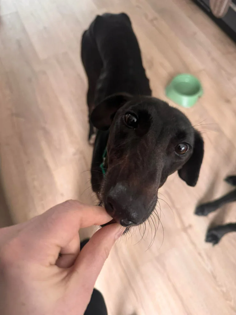 Stan the man is looking for a home where he can settle down with someone who doesn’t mind sharing the blanket on the sofa. He’s a lovely greyhound mix, standing at around hip height, but he’s very considerate of his size. He’s a handsome, all-black dog with white patches on his chest and feet.