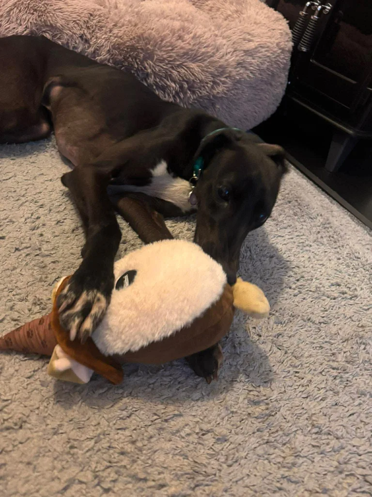 Now that Stanley has been in foster care for a little while, he’s looking fantastic. He’s put on weight, had time to relax, and his personality is really shining through. He loves a cuddle and will happily snooze with his head in your lap. In the evenings, he settles nicely into his bed. Stanley would benefit from having another dog in the home, as he enjoys having a companion to cuddle and play with. He would also be absolutely fine with children in the home, ideally aged six and over, simply due to his size. Stanley would make a wonderful family pet.