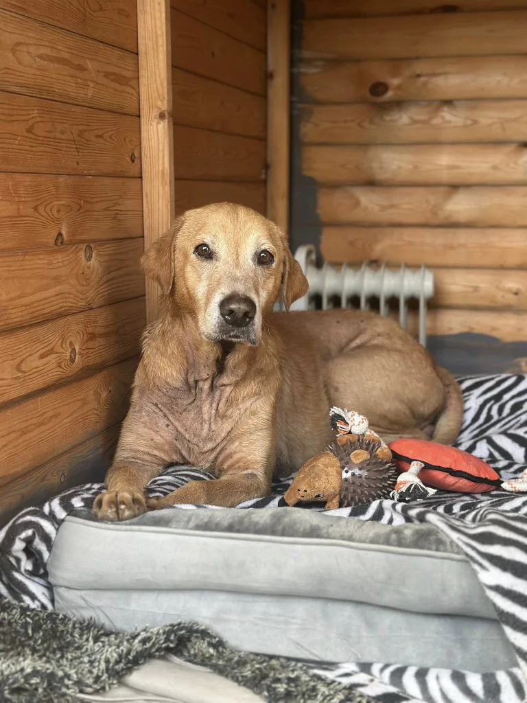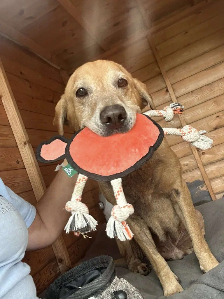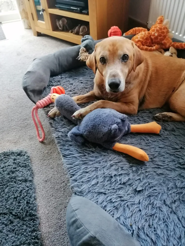 In his new home in beautiful Devon, Yogi is treated like royalty. He enjoys sunbathing in the garden, lounging on his bed after carefully selecting a toy from his extensive collection, and prancing around the fields and woodland near his home. His new Mum and Dad absolutely adore him; his sweet, affectionate nature has made him the perfect companion. He has settled in beautifully, even sneaking onto the humans’ bed for a well-deserved snooze.