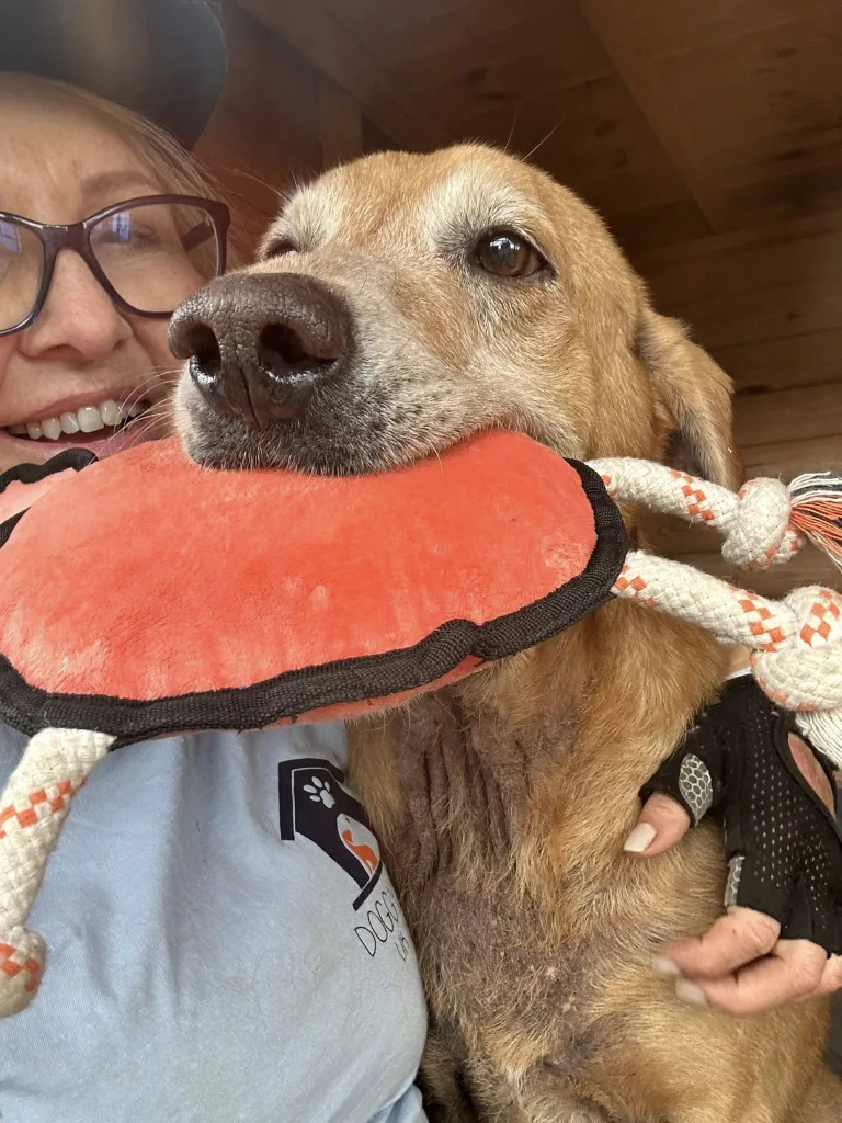Once he was settled into his own secluded kennel chalet, we spent time sitting with Yogi, talking to him and promising that we would get him back on his feet. He would have nutritious food to rebuild his strength, and as many medicated baths as it took until his fur grew back thick and shiny. His story reached so many people, and it wasn’t long before he began receiving care packages filled with toys and soft blankets. Yogi adored his new collection and would proudly bring his toys over to staff and volunteers to show them off. He soon made himself at home, happily watching the world go by.
